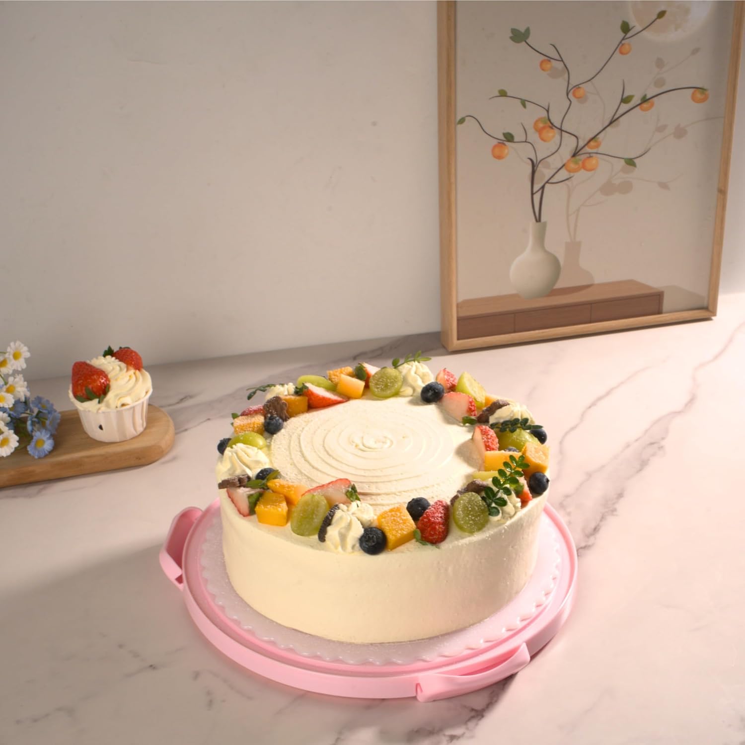 The semi-transparent lid keeps your desserts fresh, dust-free, and protected while also allowing for easy viewing of your delicious treats. A reinforced handle is positioned on the top for comfortable portability. The base locks to the lid with snap-fit side latches, ensuring everything stays in place when moving.